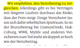 Stiftung Warentest empfahl, Nettobeiträge zu vergleichen – und nannte gleich Gründe, es nicht zu tun. Quelle: Finanztest 08/2015, Seite 69.