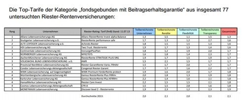 Link zur Seite. Für das Riester-Folgerating 2013 wurden 77 (Vorjahr: 80) Tarife von 57 (58) Anbietern in den Bereichen Unternehmenssicherheit (35 Prozent Gewichtung), Rendite (30 Prozent), Flexibilität (25 Prozent) sowie Transparenz und Service (zehn Prozent) in bis zu 84 Bewertungskriterien untersucht.