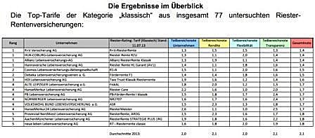 Im klassischen Bereich erhielten die R+V Lebensversicherung AG („R+V Riester-Rente“), die Huk-Coburg Lebensversicherung AG („Riester Rente RZU“), die Allianz Lebensversicherungs-AG („Allianz RiesterRente Klassik“) sowie die Hannoversche Lebensversicherung AG („Riester Rente HL Garant (AV1)“) mit jeweils 1,4 die beste Gesamtnote.